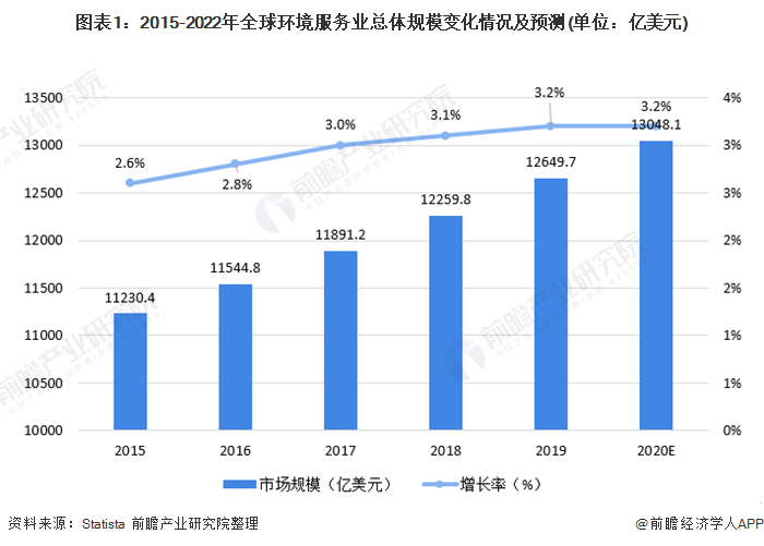隨著環(huán)境保護(hù)和可持續(xù)發(fā)展理念的廣泛普及,世界環(huán)境服務(wù)業(yè)市場(chǎng)呈現(xiàn)迅速發(fā)展的勢(shì)頭,世界各國(guó),特別是發(fā)達(dá)國(guó)家紛紛出臺(tái)相關(guān)政策并加大資金投入,加大對(duì)環(huán)保市場(chǎng)的扶持力度。2019年全球環(huán)境服務(wù)業(yè)市場(chǎng)規(guī)模達(dá)到12649.70億美元,同比增長(zhǎng)3.20%,預(yù)估全球環(huán)境服務(wù)市場(chǎng)繼續(xù)保持穩(wěn)步發(fā)展態(tài)勢(shì),2020年全球總規(guī)模達(dá)到13048.1億美元。