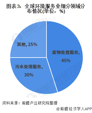環(huán)境服務(wù)業(yè)各分項(xiàng)目發(fā)展很不平衡,廢物處置服務(wù)和污水處理服務(wù)占環(huán)境服務(wù)市場(chǎng)的主要份額。目前,這兩個(gè)項(xiàng)目產(chǎn)值占全球環(huán)境服務(wù)市場(chǎng)的75%,其中廢物處置服務(wù)占45%,污水處理服務(wù)占30%。
