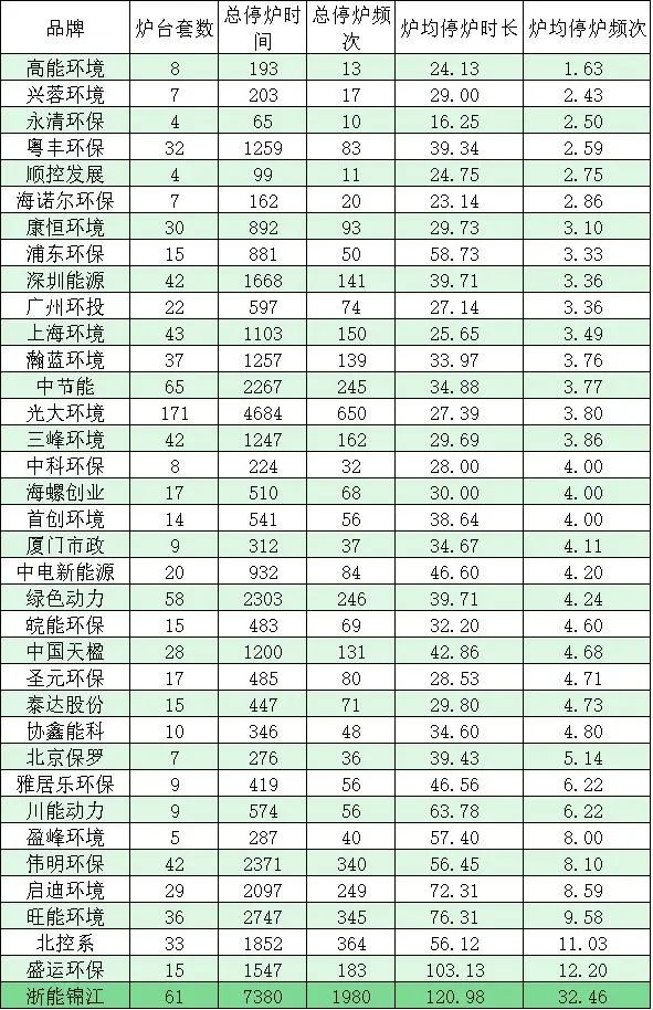 數(shù)據(jù)顯示,順控發(fā)展、粵豐環(huán)保、高能環(huán)境、興蓉環(huán)境、深能環(huán)保等五家品牌企業(yè),旗下每臺焚燒爐的非停頻次平均都小于1。