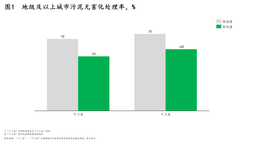 在此背景下,各級(jí)政府最終選擇先將污泥處理放一放,將有限資金優(yōu)先用于污水處理設(shè)施和管網(wǎng)建設(shè),這導(dǎo)致國(guó)內(nèi)“重水輕泥”的傾向明顯,“十二五”和“十三五”規(guī)劃中的地級(jí)及以上城市污泥無(wú)害化處理率目標(biāo)兩次落空也就見(jiàn)怪不怪了(見(jiàn)圖1)。