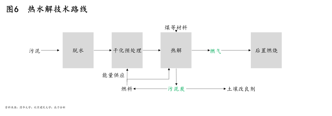 而在資源回收上,相比好氧堆肥,干化焚燒及熱水解則是更好的資源化方式,值得重點(diǎn)關(guān)注。干化焚燒的技術(shù)路線如圖5所示,作為最快捷、最徹底實(shí)現(xiàn)污泥減量化、穩(wěn)定化、無(wú)害化的最終處置技術(shù),干化焚燒后的資源化利用產(chǎn)品也更易走通;熱水解的技術(shù)路線如圖6所示,其生產(chǎn)過(guò)程清潔化,生成的污泥炭資源多樣化。