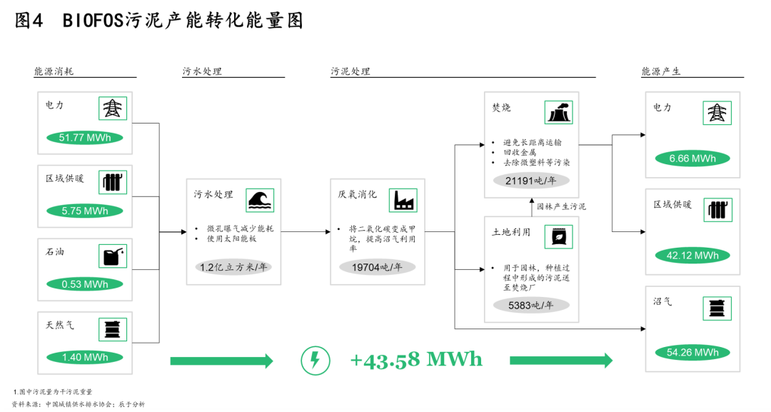 其二,30·60雙碳目標(biāo)提出后,未來(lái)污泥處理處置將以節(jié)能降耗及能源資源回收為目標(biāo),這對(duì)污泥處理提出了更為清晰的技術(shù)路徑方向。例如在能源回收上,厭氧消化是優(yōu)選途徑,如丹麥污水廠BIOFOS通過(guò)污泥消化產(chǎn)能實(shí)現(xiàn)能量盈余(見(jiàn)圖4)。