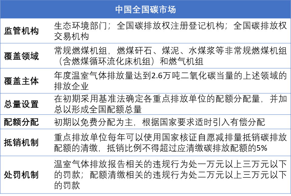 目前,中國(guó)的全國(guó)碳市場(chǎng)已經(jīng)進(jìn)入交易前的最后準(zhǔn)備階段。參考生態(tài)環(huán)境部發(fā)布的《2019-2020年全國(guó)碳排放權(quán)交易配額總量設(shè)定與分配實(shí)施方案(發(fā)電行業(yè))》、《碳排放權(quán)交易管理辦法(試行)》以及《碳排放權(quán)交易管理暫行條例(草案修改稿)》等文件,即將啟動(dòng)的全國(guó)碳市場(chǎng)將以生態(tài)環(huán)境部門(mén)為主要監(jiān)管機(jī)構(gòu)、覆蓋范圍為化石能源發(fā)電及發(fā)熱行業(yè)的二氧化碳排放,在初期通過(guò)基準(zhǔn)法確定各重點(diǎn)排放單位的配額分配量,并加總以形成全國(guó)配額總量。此外,初期的配額分配將以免費(fèi)分配為主,同時(shí)允許以國(guó)家核證自愿減排量抵銷(xiāo)碳排放配額,抵消比例不得超過(guò)應(yīng)清繳碳排放配額的5%。相關(guān)的機(jī)制設(shè)計(jì)見(jiàn)下表: