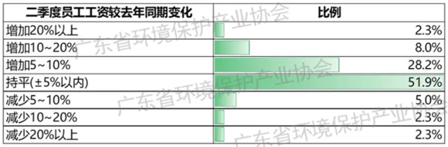 員工工資方面,38.5%的環(huán)保企業(yè)反饋員工工資相比去年同期增加,51.9%的環(huán)保企業(yè)表示同期基本持平,9.5%的環(huán)保企業(yè)則表示員工工資同期減少。