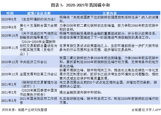碳中和指通過植樹造林、節(jié)能減排等方法增加碳吸收量,將碳吸收量與碳排放量抵消,實現(xiàn)碳中和。碳達峰就是二氧化碳的排放不再增長,達到峰值之后再慢慢減下去,是碳中和前必須經(jīng)過的階段。2020年9月,在第75屆聯(lián)合國大會上,我國提出二氧化碳排放力爭在2030年前達峰,努力爭取2060年實現(xiàn)碳中和。2020年12月,中央經(jīng)濟工作會議將“做好碳達峰、碳中和工作”列為2021年的重點任務之一。2021年3月,政府工作報告中指出將制定2030年前碳排放達峰行動方案,推進優(yōu)化產(chǎn)業(yè)結構和能源結構,大力發(fā)展新能源。