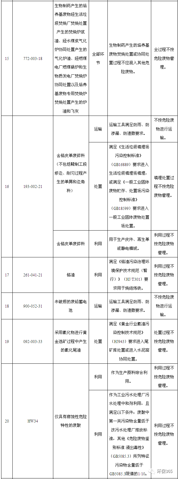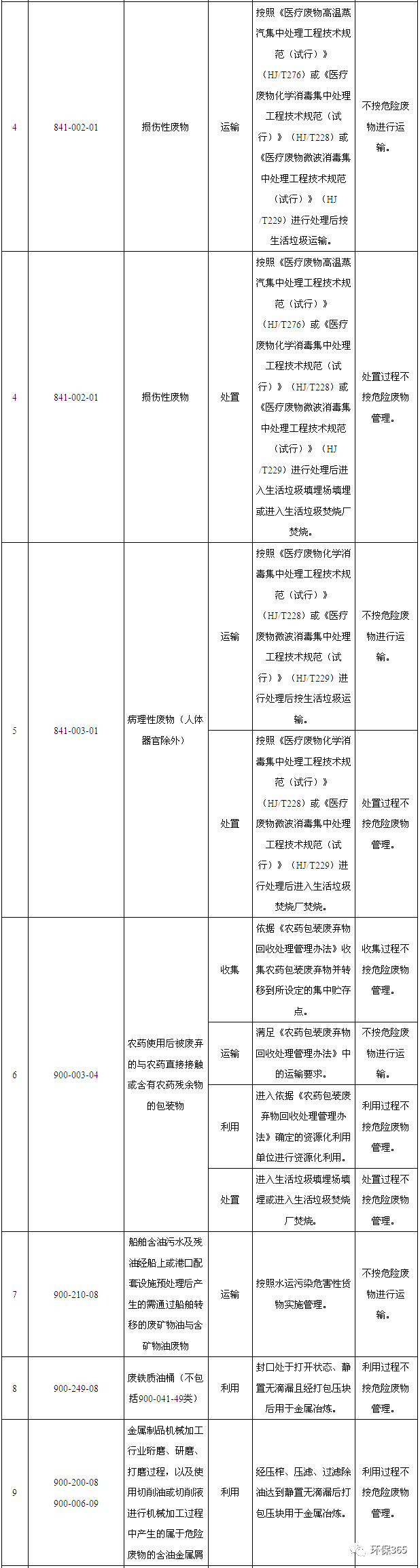 (1)家庭日常生活或者為日常生活提供服務(wù)的活動中產(chǎn)生的廢藥品、廢殺蟲劑和消毒劑及其包裝物、廢油漆和溶劑及其包裝物、廢礦物油及其包裝物、廢膠片及廢像紙、廢熒光燈管、廢含汞溫度計、廢含汞血壓計、廢鉛蓄電池、廢鎳鎘電池和氧化汞電池以及電子類危險廢物等未經(jīng)過集中收集的全部環(huán)節(jié)不按危險廢物管理;按照各市、縣生活垃圾分類要求,納入生活垃圾分類收集體系進(jìn)行分類收集,且運(yùn)輸工具和暫存場所滿足分類收集體系要求的,從分類投放點(diǎn)收集轉(zhuǎn)移到所設(shè)定的集中貯存點(diǎn)的收集過程不按危險廢物管理。(2)床位總數(shù)在19張以下(含19張)的醫(yī)療機(jī)構(gòu)產(chǎn)生的醫(yī)療廢物(重大傳染病疫情期間產(chǎn)生的醫(yī)療廢物除外)按《醫(yī)療衛(wèi)生機(jī)構(gòu)醫(yī)療廢物管理辦法》等規(guī)定進(jìn)行消毒和收集的,收集過程不按危險廢物管理;轉(zhuǎn)運(yùn)車輛符合《醫(yī)療廢物轉(zhuǎn)運(yùn)車技術(shù)要求(試行)》(GB19217)要求的,不按危險廢物進(jìn)行運(yùn)輸;重大傳染病疫情期間產(chǎn)生的醫(yī)療廢物,按事發(fā)地的縣級以上人民政府確定的處置方案進(jìn)行運(yùn)輸?shù)?,不按危險廢物進(jìn)行運(yùn)輸;按事發(fā)地的縣級以上人民政府確定的處置方案進(jìn)行處置的,處置過程不按危險廢物管理。(3)感染性廢物按照《醫(yī)療廢物高溫蒸汽集中處理工程技術(shù)規(guī)范(試行)》(HJ/T276)或《醫(yī)療廢物化學(xué)消毒集中處理工程技術(shù)規(guī)范(試行)》(HJ/T228)或《醫(yī)療廢物微波消毒集中處理工程技術(shù)規(guī)范(試行)》(HJ/T229)進(jìn)行處理后按生活垃圾運(yùn)輸?shù)?,不按危險廢物進(jìn)行運(yùn)輸;按照《醫(yī)療廢物高溫蒸汽集中處理工程技術(shù)規(guī)范(試行)》(HJ/T276)或《醫(yī)療廢物化學(xué)消毒集中處理工程技術(shù)規(guī)范(試行)》(HJ/T228)或《醫(yī)療廢物微波消毒集中處理工程技術(shù)規(guī)范(試行)》(HJ/T229)進(jìn)行處理后進(jìn)入生活垃圾填埋場填埋或進(jìn)入生活垃圾焚燒廠焚燒的,處置過程不按危險廢物管理。(4)損傷性廢物按照《醫(yī)療廢物高溫蒸汽集中處理工程技術(shù)規(guī)范(試行)》(HJ/T276)或《醫(yī)療廢物化學(xué)消毒集中處理工程技術(shù)規(guī)范(試行)》(HJ/T228)或《醫(yī)療廢物微波消毒集中處理工程技術(shù)規(guī)范(試行)》(HJ/T229)進(jìn)行處理后按生活垃圾運(yùn)輸?shù)?,不按危險廢物進(jìn)行運(yùn)輸;按照《醫(yī)療廢物高溫蒸汽集中處理工程技術(shù)規(guī)范(試行)》(HJ/T276)或《醫(yī)療廢物化學(xué)消毒集中處理工程技術(shù)規(guī)范(試行)》(HJ/T228)或《醫(yī)療廢物微波消毒集中處理工程技術(shù)規(guī)范(試行)》(HJ/T229)進(jìn)行處理后進(jìn)入生活垃圾填埋場填埋或進(jìn)入生活垃圾焚燒廠焚燒的,處置過程不按危險廢物管理。(5)病理性廢物(人體器官除外)按照《醫(yī)療廢物化學(xué)消毒集中處理工程技術(shù)規(guī)范(試行)》(HJ/T228)或《醫(yī)療廢物微波消毒集中處理工程技術(shù)規(guī)范(試行)》(HJ/T229)進(jìn)行處理后按生活垃圾運(yùn)輸?shù)?,不按危險廢物進(jìn)行運(yùn)輸;按照《醫(yī)療廢物化學(xué)消毒集中處理工程技術(shù)規(guī)范(試行)》(HJ/T228)或《醫(yī)療廢物微波消毒集中處理工程技術(shù)規(guī)范(試行)》(HJ/T229)進(jìn)行處理后進(jìn)入生活垃圾焚燒廠焚燒的,處置過程不按危險廢物管理。(6)農(nóng)藥使用后被廢棄的與農(nóng)藥直接接觸或含有農(nóng)藥殘余物的包裝物依據(jù)《農(nóng)藥包裝廢棄物回收處理管理辦法》收集并轉(zhuǎn)移到所設(shè)定的集中貯存點(diǎn)的,收集過程不按危險廢物管理;滿足《農(nóng)藥包裝廢棄物回收處理管理辦法》中的運(yùn)輸要求的,不按危險廢物進(jìn)行運(yùn)輸;進(jìn)入依據(jù)《農(nóng)藥包裝廢棄物回收處理管理辦法》確定的資源化利用單位進(jìn)行資源化利用的,利用過程不按危險廢物管理;進(jìn)入生活垃圾填埋場填埋或進(jìn)入生活垃圾焚燒廠焚燒的,處置過程不按危險廢物管理。(7)船舶含油污水及殘油經(jīng)船上或港口配套設(shè)施預(yù)處理后產(chǎn)生的需通過船舶轉(zhuǎn)移的廢礦物油與含礦物油廢物按照水運(yùn)污染危害性貨物實(shí)施管理的,不按危險廢物進(jìn)行運(yùn)輸。(8)廢鐵質(zhì)油桶(不包括900-041-49類)封口處于打開狀態(tài)、靜置無滴漏且經(jīng)打包壓塊后用于金屬冶煉的,利用過程不按危險廢物管理。(9)金屬制品機(jī)械加工行業(yè)珩磨、研磨、打磨過程,以及使用切削油或切削液進(jìn)行機(jī)械加工過程中產(chǎn)生的屬于危險廢物的含油金屬屑經(jīng)壓榨、壓濾、過濾除油達(dá)到靜置無滴漏后打包壓塊用于金屬冶煉的,利用過程不按危險廢物管理。(10)煤炭焦化、氣化及生產(chǎn)燃?xì)膺^程中產(chǎn)生的滿足《煤焦油標(biāo)準(zhǔn)》(YB/T5075)技術(shù)要求的高溫煤焦油作為原料深加工制取萘、洗油、蒽油的,利用過程不按危險廢物管理。煤炭焦化、氣化及生產(chǎn)燃?xì)膺^程中產(chǎn)生的高溫煤焦油作為粘合劑生產(chǎn)煤質(zhì)活性炭、活性焦、碳塊襯層、自焙陰極、預(yù)焙陽極、石墨碳塊、石墨電極、電極糊、冷搗糊的,利用過