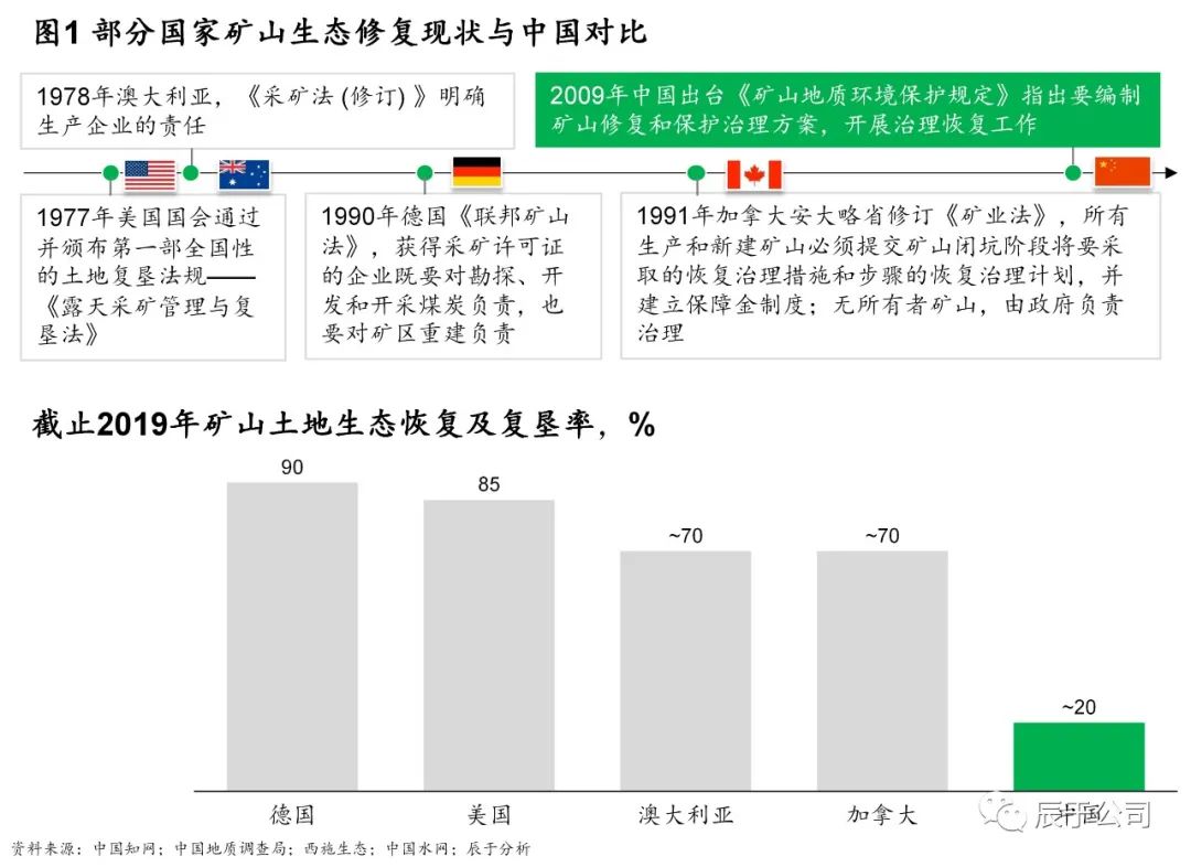 自《礦山地質(zhì)環(huán)境保護規(guī)定》2009年5月1日施行以來,我國才正式將礦山生態(tài)修復和保護治理工作提上日程,相比美國、澳大利亞、德國、加拿大等發(fā)達國家,我國礦山生態(tài)修復的起步時間晚了20~30年,也正因為此,截至2019年底,這些歐美國家累計礦山生態(tài)恢復及復墾率普遍高于70%,而中國僅為20%左右(見圖1)。