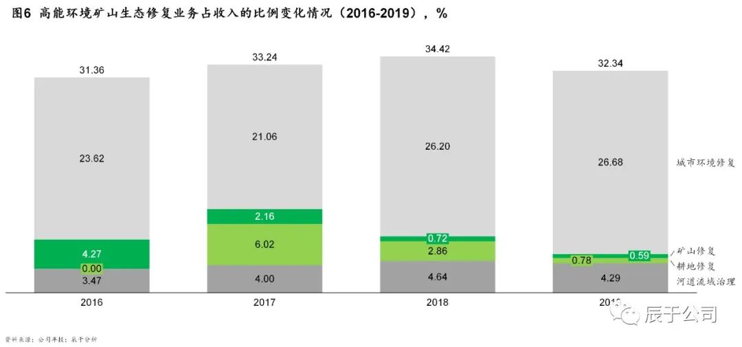 由于市場潛力并未有效釋放,領(lǐng)先的土壤修復企業(yè)參與這一市場較為謹慎,包括高能環(huán)境、中科鼎實、建工修復等龍頭在礦山生態(tài)修復領(lǐng)域的參與項目很少。以高能環(huán)境為例,近年來礦山生態(tài)修復占總收入的比重不升反降,2016年這一數(shù)字為4.27%,2019年則僅為0.59%(見圖6)。