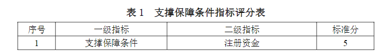 支撐保障條件指標(biāo)包括環(huán)境咨詢(xún)(環(huán)保管家)服務(wù)單位的注冊(cè)資金、上年度營(yíng)業(yè)收入、員工數(shù)量、職稱(chēng)、質(zhì)量管理體系以及業(yè)務(wù)培訓(xùn)6項(xiàng)二級(jí)指標(biāo)。支撐保障條件指標(biāo)評(píng)分見(jiàn)表1。
