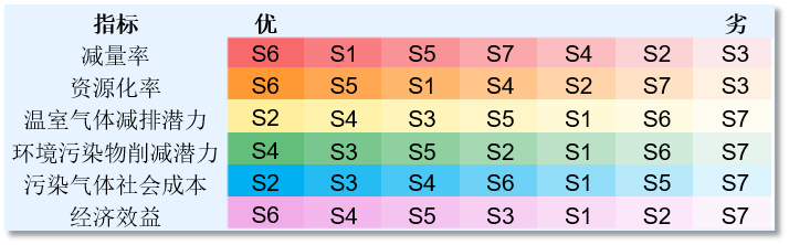 資源化率為資源化產(chǎn)品的產(chǎn)出量。S6處理技術(shù)資源利用率高、有機(jī)肥產(chǎn)品市場大而且具有最高的盈利能力。S4的資源產(chǎn)品主要是有機(jī)酸性土壤改良劑和有機(jī)肥料,具有很好的土壤改良和施肥效果。