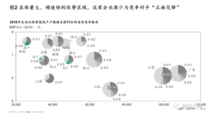 這是我們服務(wù)過的一家全國性生態(tài)環(huán)保企業(yè)的區(qū)域布局(見圖2,為保護隱私,數(shù)據(jù)已做處理),可以看到,在那些規(guī)模大、增速快的地區(qū),這家企業(yè)的市場占有率很低,盡管它的規(guī)模已位居全國前20強。這種“劍走偏鋒”其實反映出生態(tài)環(huán)保市場競爭的無奈:時至今日,“關(guān)系”似乎仍然是決定項目能否拿到手的最重要因素,技術(shù)、產(chǎn)品、運營、品牌都不重要,但唯獨不能沒有關(guān)系。上述的這些區(qū)域正是這家企業(yè)的“關(guān)系”所在。