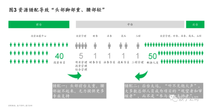 不難發(fā)現(xiàn),近年來一些企業(yè)開始“招兵買馬”,大量招聘投資拓展人員,這對于企業(yè)提高投資拓展能力自然是好事。不過我們也注意到,一些企業(yè)在投資相關(guān)的人員配置上卻不盡合理:他們通常把大量投資拓展人員“撒在前線”,同時建立“大后臺”,與投資相關(guān)的投管、財務(wù)、法務(wù),甚至技術(shù)、工程、運營等人員主要負責(zé)項目質(zhì)量把關(guān)和風(fēng)險管控,只有少量人員在中臺為前臺提供“彈藥”和支持(見圖3)。這種“頭重腳重”帶來兩個“錯配”,一是頭部前臺太重,腰部挺不起來,無力提供更多專業(yè)支持;二是腳部后臺太遠,“聽不見炮火聲”,大多數(shù)人成為項目的“觀望者和審核者”,而不是“參與者和支持者”。