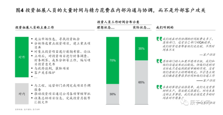 理想狀態(tài)下,對外對內(nèi)工作的時間分配比例應(yīng)該是7:3,甚至更高也不為過,但現(xiàn)實往往相反,由于內(nèi)部協(xié)同效率不高、流程繁冗、“人治”問題嚴重,我們發(fā)現(xiàn)一些投資拓展人員更多的時間與精力花費在內(nèi)部溝通與協(xié)調(diào),而不是外部客戶攻關(guān)(見圖4)。造成這種現(xiàn)象的原因,表面看上去是內(nèi)部流程繁瑣,決策鏈條冗長,實則是內(nèi)部沒有形成一以貫之以市場為導(dǎo)向、以項目為核心的理念文化。平時大多只是喊喊口號而已,并未真正付諸行動。