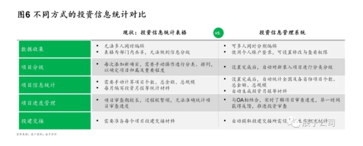 此外,我國生態(tài)環(huán)保產(chǎn)業(yè)數(shù)字化滲透率尚處于較低水平,即使是頭部企業(yè),也僅是在財務(wù)、行政、人力資源、工程等條線進行了IT系統(tǒng)建設(shè),投資管理的IT系統(tǒng)建設(shè)很少,更別提利用大數(shù)據(jù)、機器學(xué)習(xí)、人工智能等先進技術(shù)為投資決策提供支持了,不管是數(shù)據(jù)收集、還是項目分級、信息統(tǒng)計、進度管理、投建交接等工作,基本依靠手動操作,效率低下且容易出錯(見圖6)。
