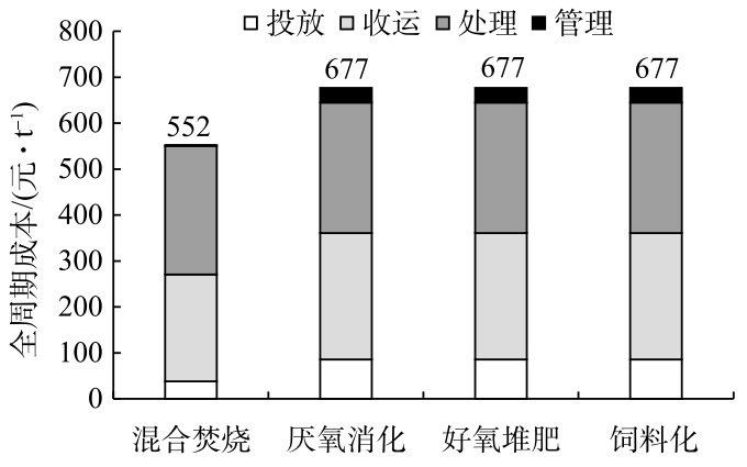 混合焚燒的全周期費(fèi)用最低,而分類處理的全周期費(fèi)用高出 125 元·t?1。這主要是由于垃圾分類增加了前端投放督導(dǎo)和宣教監(jiān)管費(fèi)用,此外收運(yùn)費(fèi)用也略高于混合焚燒。除上述費(fèi)用外,垃圾收運(yùn)處理設(shè)施也會占用一定的土地,由于占地面積和工藝路線、設(shè)計(jì)方案有關(guān),同時土地費(fèi)用差別很大,這里不計(jì)入比較。