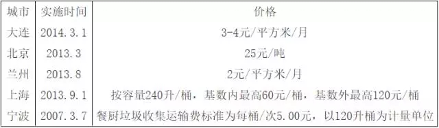 我國部分城市餐廚垃圾處理收費(fèi)標(biāo)準(zhǔn)