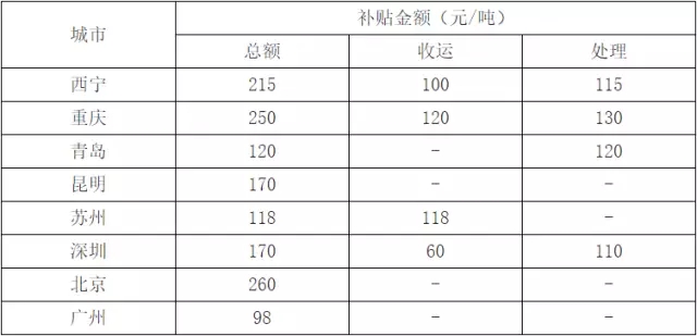 我國部分城市餐廚運(yùn)營補(bǔ)貼