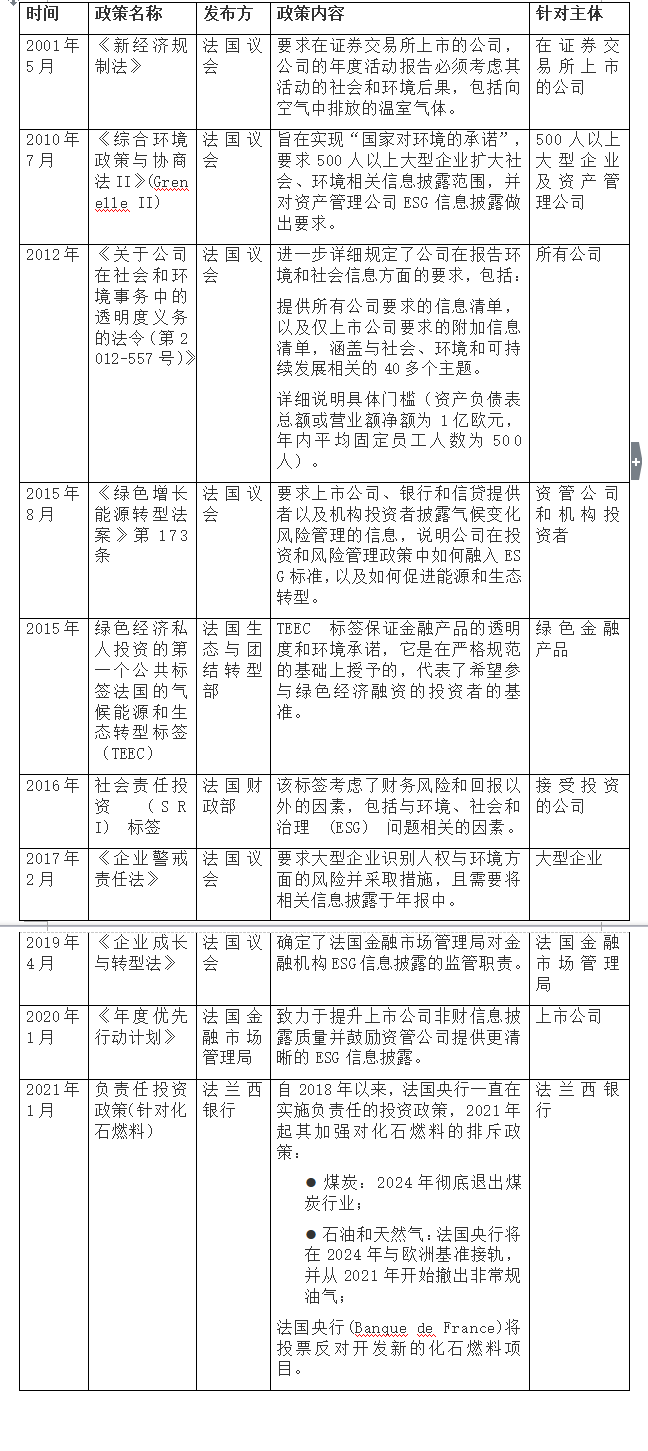 法國是全世界第一個將綠色金融納入法律范疇的國家。早在2001年,法國政府頒布新經(jīng)濟規(guī)制法案(NRE法案),啟動強制性財務(wù)外報告,要求上市公司披露其活動對環(huán)境和社會的影響。2010年的“Grenelle II 法案”第225條包含強制企業(yè)社會責(zé)任(CSR)信息披露的內(nèi)容,要求公司在年報中披露其環(huán)境及社會業(yè)績方面的信息。2012年,法國通過了關(guān)于公司在社會和環(huán)境事務(wù)中的透明度義務(wù)的法令(第2012-557號),進一步詳細規(guī)定了公司在報告環(huán)境和社會信息方面的要求。對于法國金融界來說,《綠色增長能源轉(zhuǎn)型法案》173條是最具影響力的法案,明確要求上市公司、銀行和信貸提供者以及機構(gòu)投資者(資產(chǎn)所有者和投資經(jīng)理)提高氣候變化相關(guān)風(fēng)險的披露與透明度,該法案還包括與氣候相關(guān)金融信息披露工作組(TCFD)密切相關(guān)的措施,并要求法國當局評估銀行業(yè)與氣候相關(guān)的風(fēng)險,法國成為世界上第一個對金融機構(gòu)提出ESG信息披露要求的主要經(jīng)濟體。2015年,法國生態(tài)與團結(jié)轉(zhuǎn)型部發(fā)布了綠色經(jīng)濟私人投資的第一個公共標簽——法國的氣候能源和生態(tài)轉(zhuǎn)型標簽(TEEC),TEEC標簽確保了金融產(chǎn)品的透明性和環(huán)保性,它授予條件嚴格,代表了參與綠色經(jīng)濟融資的投資者的要求。2016年,法國財政部提出了社會責(zé)任投資(SRI)標簽,該標簽考慮了財務(wù)風(fēng)險和回報以外的因素,包括與環(huán)境、社會和治理(ESG)問題相關(guān)的因素。2021年1月,法蘭西銀行針對自身投資發(fā)布了一項新的負責(zé)任投資政策,以加強其對化石燃料的排斥政策。據(jù)此,法蘭西銀行表示到2024年底,完全排除所有從事煤炭相關(guān)活動的公司,無論規(guī)模如何;2024年與歐洲基準保持一致,2021年開始退出開始撤出非常規(guī)油氣;投票反對開發(fā)新的化石燃料項目。2021年3月,法蘭西銀行成立了氣候變化中心,以監(jiān)測其與氣候變化相關(guān)的所有舉措并確保其協(xié)調(diào)。