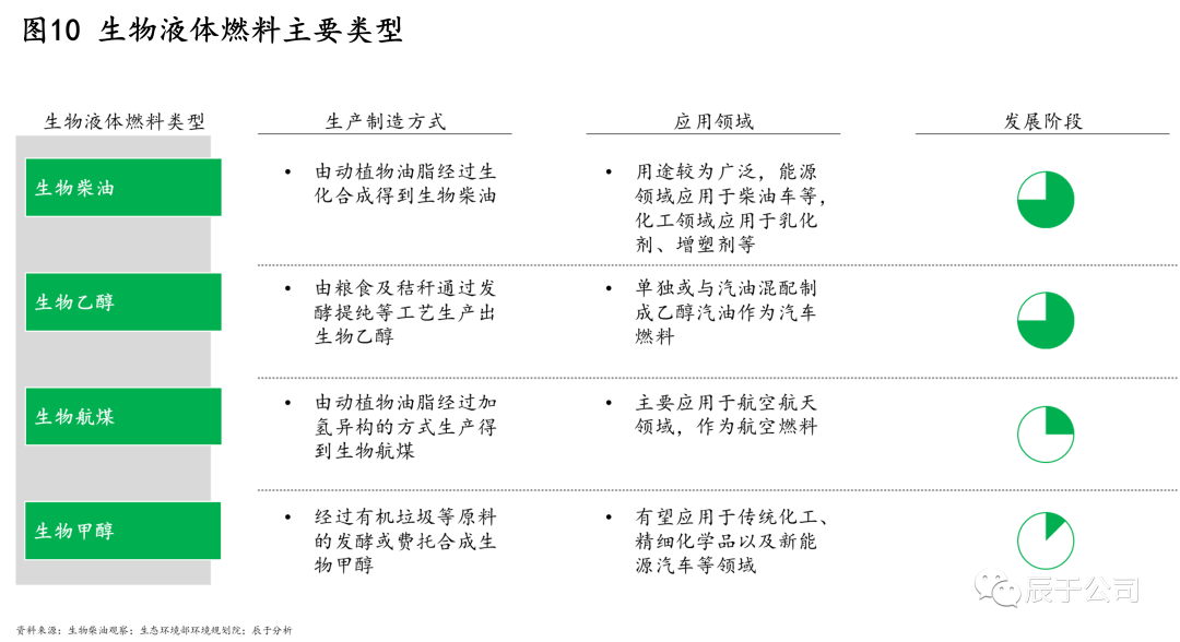生物液體燃料是指把生物質(zhì)經(jīng)過發(fā)酵提純或者生化合成的方式制造成乙醇或油類等液體燃料,目前主要包括生物柴油、生物乙醇、生物航煤、生物甲醇等類型,生產(chǎn)制造方式各異,其中生物柴油、生物乙醇發(fā)展較為成熟(圖10)。