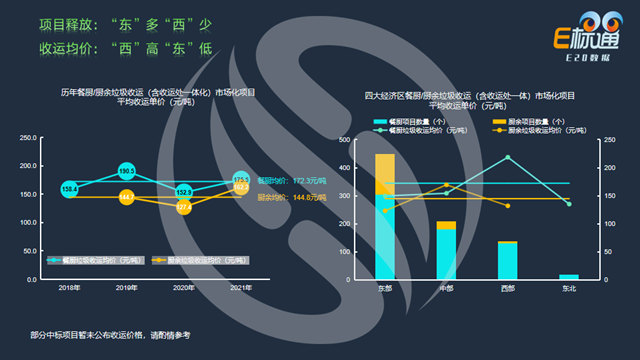 聚焦收運環(huán)節(jié),近三年餐廚垃圾收運均價為172.3元/噸,廚余垃圾收運均價為144.8元/噸,左圖是歷年餐廚/廚余垃圾收運(含收運處一體化)市場化項目平均收運價格的情況;右圖是四大經(jīng)濟(jì)區(qū)餐廚/廚余垃圾平均收運單價情況,其中:西部地區(qū)的餐廚垃圾收運均價較高,中部地區(qū)廚余垃圾的收運價格較高,E20研究院數(shù)據(jù)研究中心認(rèn)為中西部地區(qū)收運價格偏高或與收運距離有關(guān)。