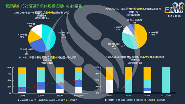 左邊兩圖分別是餐廚和廚余垃圾分散式和集中式處理方式占比情況,2018至2021上半年餐廚垃圾(左上圖)利用分散式方式處理的項目占比為54%,廚余垃圾(左下圖)利用分散式處理的占比更高一些(57%);此外,廚余垃圾的集中式處理方式又分為兩種情況,一種是純廚余垃圾建廠處理的集中式處理模式,另一種是和餐廚垃圾廠協(xié)同處理的集中式處理模式,在總量中占比分別為11%和32%。