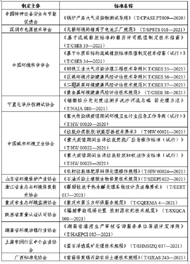 10月,全國團體標(biāo)準(zhǔn)信息平臺公布了21項生態(tài)保護和環(huán)境治理類團體標(biāo)準(zhǔn),詳見下表。