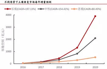 土壤修復(fù)十三五市場(chǎng)空間1100億-5900億,遠(yuǎn)期市場(chǎng)總量在7.4萬(wàn)億元左右。在中性情景下,十三五市場(chǎng)空間總量約3400億。