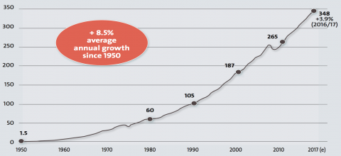 但是請環(huán)顧一下四周,有沒有發(fā)現(xiàn)你其實是被塑料包圍著。無論你在哪,塑料,這個人類創(chuàng)造的材料它一定在你身邊。自從上世紀五六十年代塑料被規(guī)?;a(chǎn)以來,它已經(jīng)取代了大部分其它材料,被用到了人類生活生產(chǎn)的各方各面。全球2018年生產(chǎn)的塑料總量按體積計算的話已經(jīng)超過了鋼的產(chǎn)量,達3.6億噸(塑料平均密度約1.1;鋼18.3億噸,密度7.8)。全球累計生產(chǎn)的塑料到2019年達到90億噸,相當于1000座北京景山的重量。