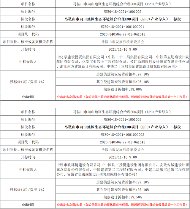 2021年11月17日,馬鞍山市公告資源交易中心發(fā)布《馬鞍山市向山地區(qū)生態(tài)環(huán)境綜合治理EOD項目(EPC+產(chǎn)業(yè)導(dǎo)入)項目中標公示》。