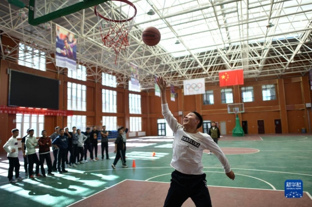 11月25日,青海省海南藏族自治州興??h民族高級(jí)中學(xué)學(xué)生在室內(nèi)籃球館訓(xùn)練。新華社記者 駱曉飛 攝