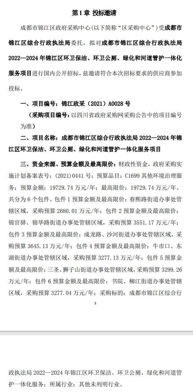四川省公共資源交易網(wǎng)公布《成都市錦江區(qū)綜合行政執(zhí)法局2022—2024年錦江區(qū)環(huán)衛(wèi)保潔、環(huán)衛(wèi)公廁、綠化和河道管護一體化服務(wù)項目公開招標公告》。