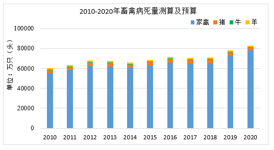 根據(jù)國家統(tǒng)計(jì)局、農(nóng)業(yè)農(nóng)村部公開畜禽出欄量/存欄量數(shù)據(jù)測算病死量。養(yǎng)殖場的畜禽死亡率一般在5%~10%之間,若按5%計(jì)算,我國畜禽死亡量從2010年6.03億頭(只)增長至2020年的8.25億頭(只),復(fù)合增長率3%,其中家禽類占據(jù)大部分。由于2018年“非洲豬瘟”疫情我國累積撲殺近100萬頭生豬,實(shí)際死亡量可能高于預(yù)測數(shù)值。死畜禽攜帶大量的病原微生物,不僅污染環(huán)境,對(duì)于人體健康和畜禽養(yǎng)殖業(yè)的健康發(fā)展也存在嚴(yán)重威脅。因此,對(duì)死畜禽進(jìn)行無害化處理是解決環(huán)境污染、實(shí)現(xiàn)畜牧業(yè)良性發(fā)展的必由之路。