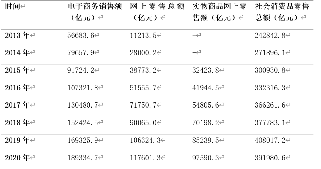 近年來我國互聯(lián)網(wǎng)產(chǎn)業(yè)呈現(xiàn)高速發(fā)展態(tài)勢,網(wǎng)民數(shù)量與互聯(lián)網(wǎng)普及率不斷增長,為網(wǎng)絡(luò)購物奠定了龐大的用戶基礎(chǔ)。數(shù)據(jù)顯示,截至2020年3月,我國網(wǎng)民規(guī)模達9.04億人,互聯(lián)網(wǎng)普及率為64.5%,較2018年底提升4.9個百分點。與此同時,電子商務(wù)市場規(guī)模也在不斷增長。2020年,電商領(lǐng)域總就業(yè)人數(shù)達到6015萬,較2019年增長約17.35%,預(yù)計到2025年將達到7000萬人。此外,2021年上半年,我國電商用戶達8.12 億,較2020年12月增長2965萬。2020年網(wǎng)上零售額為11.76萬億元,是2013年的10.5倍,占社會消費品零售額的比重由2013年的5%增長到2020年的30%。《2021年中國電商年度發(fā)展報告》顯示,今年前三季度我國網(wǎng)上零售額達9.19萬億元,同比增長18.5%。