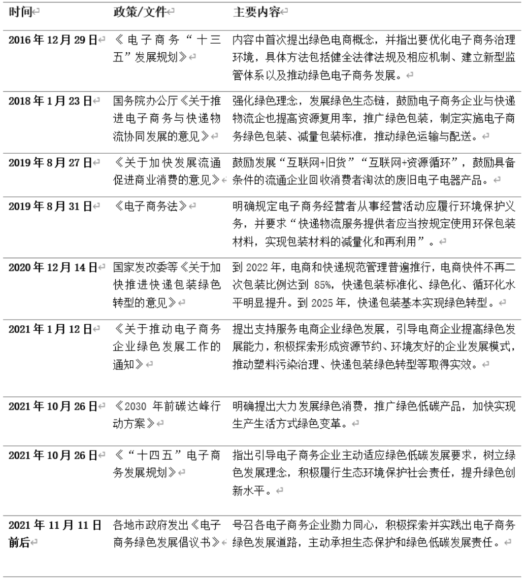 隨著數(shù)字化戰(zhàn)略得到系統(tǒng)闡釋和持續(xù)推進,互聯(lián)網(wǎng)服務(wù)持續(xù)滲透,網(wǎng)絡(luò)購物與傳統(tǒng)行業(yè)和實體經(jīng)濟的融合不斷加深,對社會經(jīng)濟發(fā)展提供了重要動力。在綠色消費方式的踐行上,加快推進線上綠色消費的推廣是至關(guān)重要的一環(huán)。相關(guān)政府機構(gòu)也在積極推進,并制定相應(yīng)的戰(zhàn)略規(guī)劃和產(chǎn)業(yè)政策,從未來電商行業(yè)綠色發(fā)展方向、工作要點等方面給予戰(zhàn)略指導(dǎo)和資源支持,明確指出推動電商企業(yè)綠色發(fā)展,從生產(chǎn)、包裝、物流等多維度加強企業(yè)環(huán)境保護能力,要求相關(guān)企業(yè)積極履行環(huán)境保護的社會責任。相關(guān)產(chǎn)業(yè)政策如下表所示: