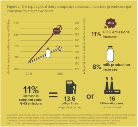 乳制品指的是使用牛乳或羊乳及其加工制品為主要原料,加入或不加入適量的維生素、礦物質(zhì)和其他輔料,使用法律法規(guī)及標(biāo)準(zhǔn)規(guī)定所要求的條件,經(jīng)加工制成的各種食品。乳制品包括液體乳(巴氏殺菌乳、滅菌乳、調(diào)制乳、發(fā)酵乳);乳粉(全脂乳粉、脫脂乳粉、部分脫脂乳粉、調(diào)制乳粉、牛初乳粉);其他乳制品(等)。國際農(nóng)業(yè)和貿(mào)易政策研究所(IATP)2020年發(fā)布的《Milking the Planet》報告指出,乳制品行業(yè)是全球溫室氣體排放量上升的主要原因之一。報告中提到2017年全球十三大乳制品公司產(chǎn)生了超過3.38億噸的溫室氣體,已經(jīng)超過了兩個全球最大的化石燃料排放企業(yè)總部位于澳大利亞的礦業(yè)、石油和天然氣巨頭(BHP)和總部位于美國的石油公司(ConocoPhillips)。盡管各國政府在2015年簽署了《巴黎協(xié)定》,致力于控制碳排放量,但2015-2017年這13家公司的總排放量仍增長了11%,增加的3230萬噸溫室氣體相當(dāng)于一年內(nèi)行駛690萬輛乘用車造成的污染。