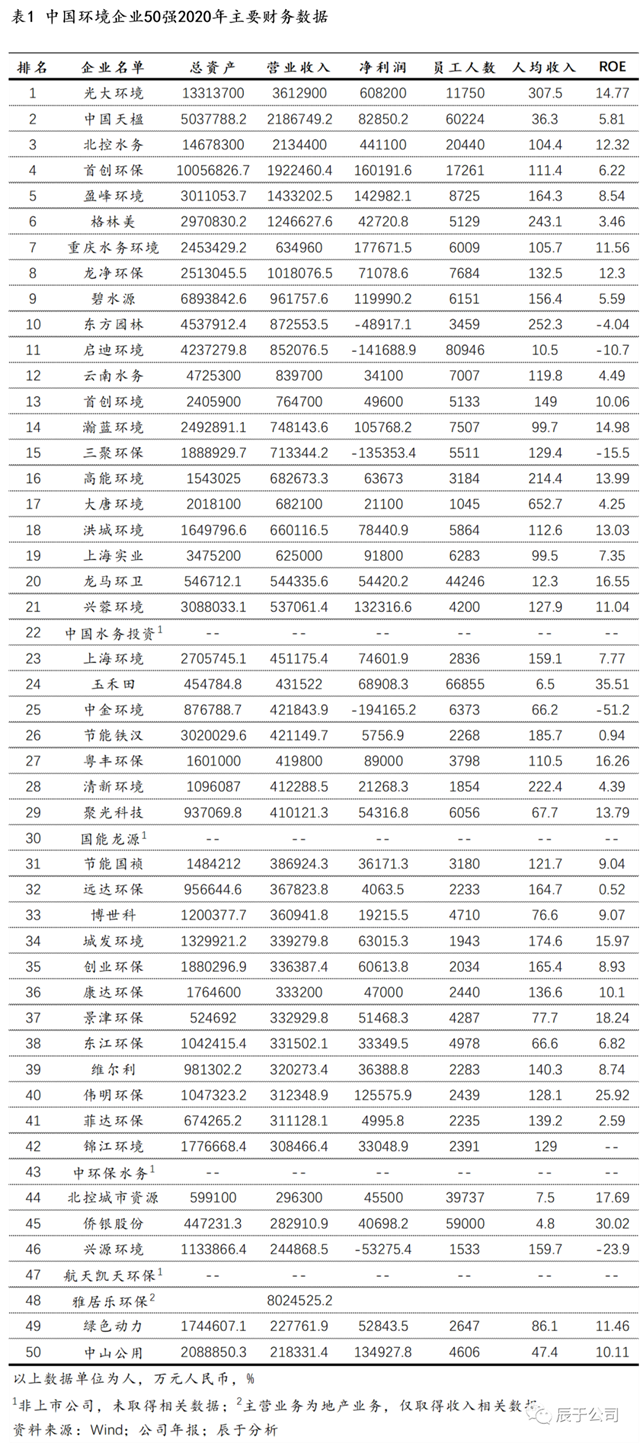 2021年7月全國(guó)工商聯(lián)環(huán)境商會(huì)發(fā)布了最新一期的中國(guó)環(huán)境企業(yè)50強(qiáng)榜單,辰于對(duì)榜單中企業(yè)的主要財(cái)務(wù)數(shù)據(jù)(見表 1)進(jìn)行統(tǒng)計(jì)發(fā)現(xiàn),光大環(huán)境高居榜首收入達(dá)到361億元,超過第二名65%;企業(yè)需要收入超過21億元才能進(jìn)入50強(qiáng),超過87億元才能進(jìn)入前10強(qiáng);由于主營(yíng)業(yè)務(wù)差異,各企業(yè)在人均收入、ROE等指標(biāo)上也有較大差距,環(huán)衛(wèi)行業(yè)的企業(yè)人均收入都比較低,其他領(lǐng)域的人均收入平均150萬元左右。