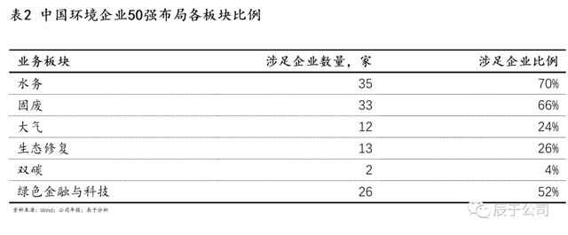 通過對(duì)中國(guó)環(huán)境企業(yè)50強(qiáng)的全面梳理,我們發(fā)現(xiàn)在業(yè)務(wù)布局上,水務(wù)、固廢、綠色金融與科技是這些企業(yè)布局較多的行業(yè),比例分別達(dá)到70%、66%、52%,生態(tài)修復(fù)、大氣和雙碳則較少企業(yè)布局,比例為26%、24%、4%(見表2)。