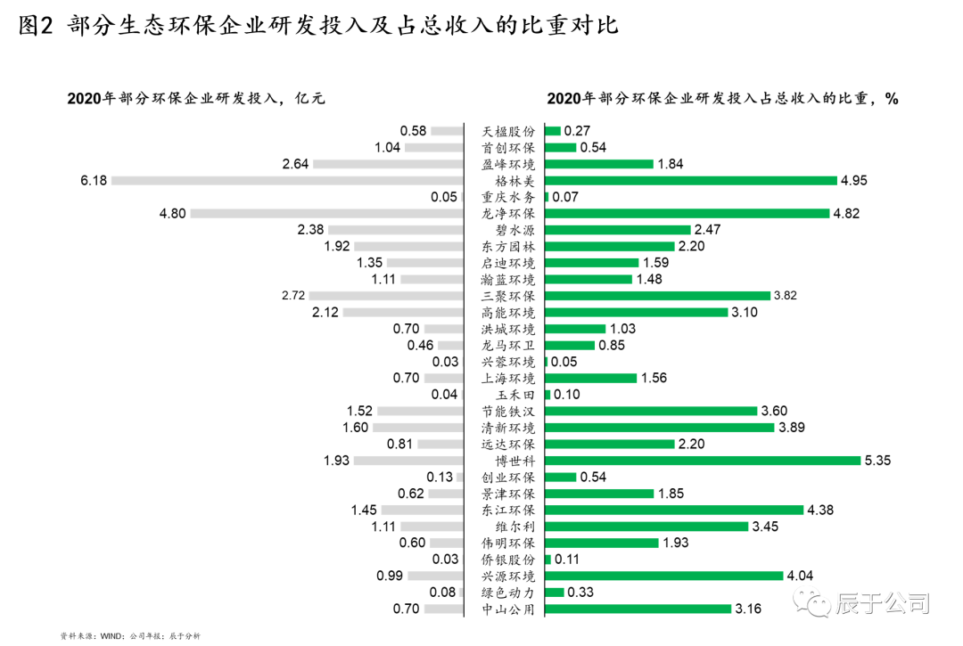 造成以上問題的原因很多,主要有兩個:一是國內(nèi)生態(tài)環(huán)保行業(yè)之前一直處于簡單、粗暴的“跑馬圈地”時代,強政府關(guān)系和低成本融資成為這一階段企業(yè)制勝的“不二法寶”,這種“浮躁”的大環(huán)境導致很多企業(yè)“重投建、輕技運”;二是創(chuàng)新型和革新型技術(shù)投入周期長,回報不明顯,很多企業(yè)尤其是三年任期制下的國企高層們?nèi)狈ψ銐蚰托?,容錯機制缺失也讓他們對高風險的研發(fā)投入持謹慎態(tài)度,這從生態(tài)環(huán)保領(lǐng)域的上市企業(yè)的研發(fā)投入占收入的比重可見一斑(見圖2)。