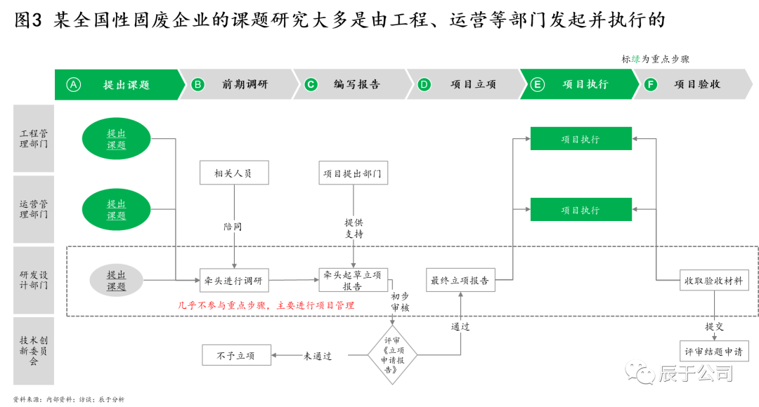 我們也注意到,很多生態(tài)環(huán)保企業(yè)研發(fā)活動的起點并非由戰(zhàn)略驅(qū)動,更多來自工程、運營等業(yè)務上的具體問題,技術(shù)研發(fā)則處于配合和支持其他部門的位置,引領(lǐng)性不足(見圖3)。由于缺乏對公司未來發(fā)展的前瞻性思考,他們也并未對各細分市場的發(fā)展趨勢、競爭對手、客戶需求、政策法規(guī)等進行深入分析,明確的產(chǎn)品規(guī)劃包括產(chǎn)品類型定義、定位以及如何與競爭對手實現(xiàn)差異化戰(zhàn)略等也就無從說起。