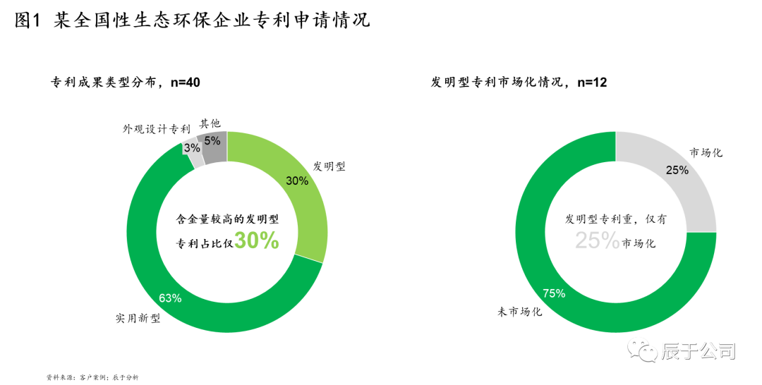 以我們服務過的某全國性生態(tài)環(huán)保企業(yè)為例,盡管營業(yè)收入已近70億元,但當年的研發(fā)投入不足1000萬元,專利申請數(shù)區(qū)區(qū)40件,且63%的為實用新型專利,含金量較高的發(fā)明型專利僅占30%,其中又只有25%的進行了商業(yè)應用(見圖1)。