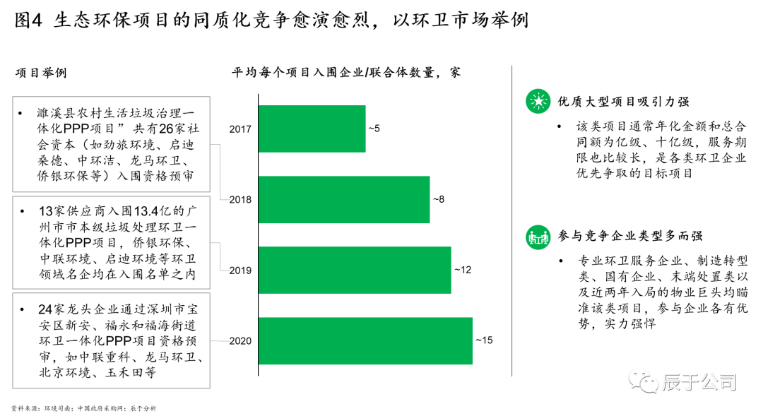 這樣帶來的直接后果就是同質(zhì)化競爭愈演愈烈,價格戰(zhàn)時有發(fā)生,不僅影響企業(yè)的盈利水平,也對后期的運營帶來隱患。由于缺乏有門檻的技術(shù)壁壘,一些環(huán)保項目的招標活動動輒十幾家甚至數(shù)十家企業(yè)參加(見圖4),而針對一些技術(shù)難度大的項目,要么無人問津不敢接手,要么接手了之后最終陷于無計可施的尷尬境地。