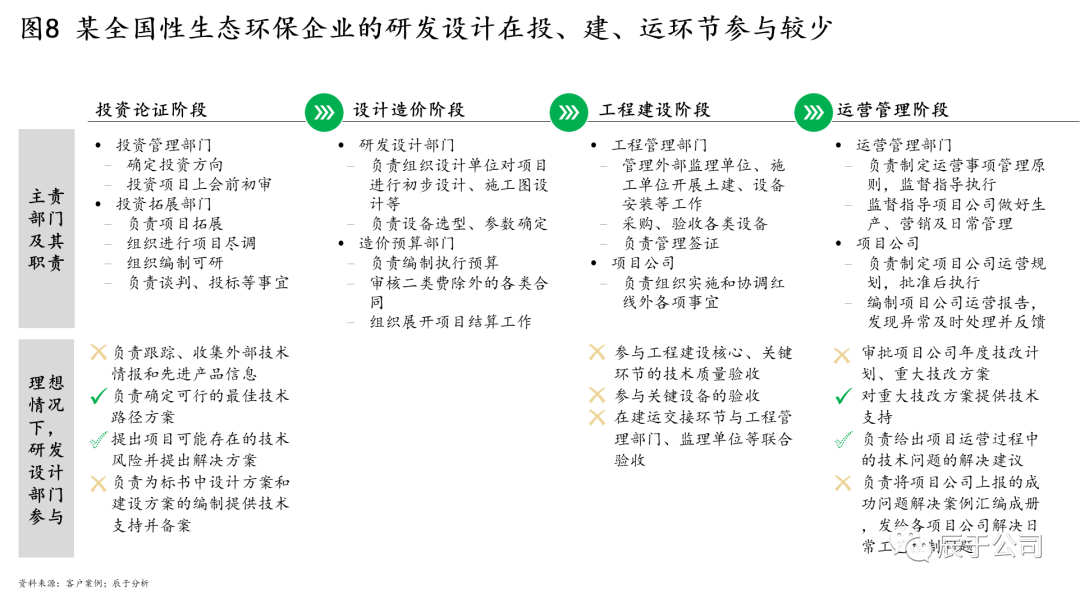 國內(nèi)生態(tài)環(huán)保企業(yè)“重投建、輕技運”的問題由來已久,由于沒有將研發(fā)設(shè)計放在一個正確的位置與高度,導致總部-事業(yè)部-項目公司的研發(fā)設(shè)計定位不清,該總部牽頭做的沒人做,該項目公司負責的,由于目的明確、相對簡單,各級主體“搶著做”,原本有限的技術(shù)資源散亂在內(nèi)部的各個層級和角落,沒有形成各司其職、各盡其責、上下一致的合力。