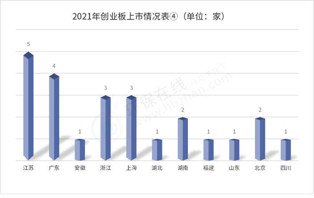 上述數(shù)據(jù)顯示,2021年,登陸創(chuàng)業(yè)板的環(huán)保企業(yè)以江蘇最多,廣東次之,浙江和上海均有三家,整體覆蓋11個(gè)省市。除了江浙、北上廣以及福建這些市場(chǎng)“寵兒”,“兩湖”加皖魯川也各有斬獲,總體來看南方市場(chǎng)比較受歡迎。