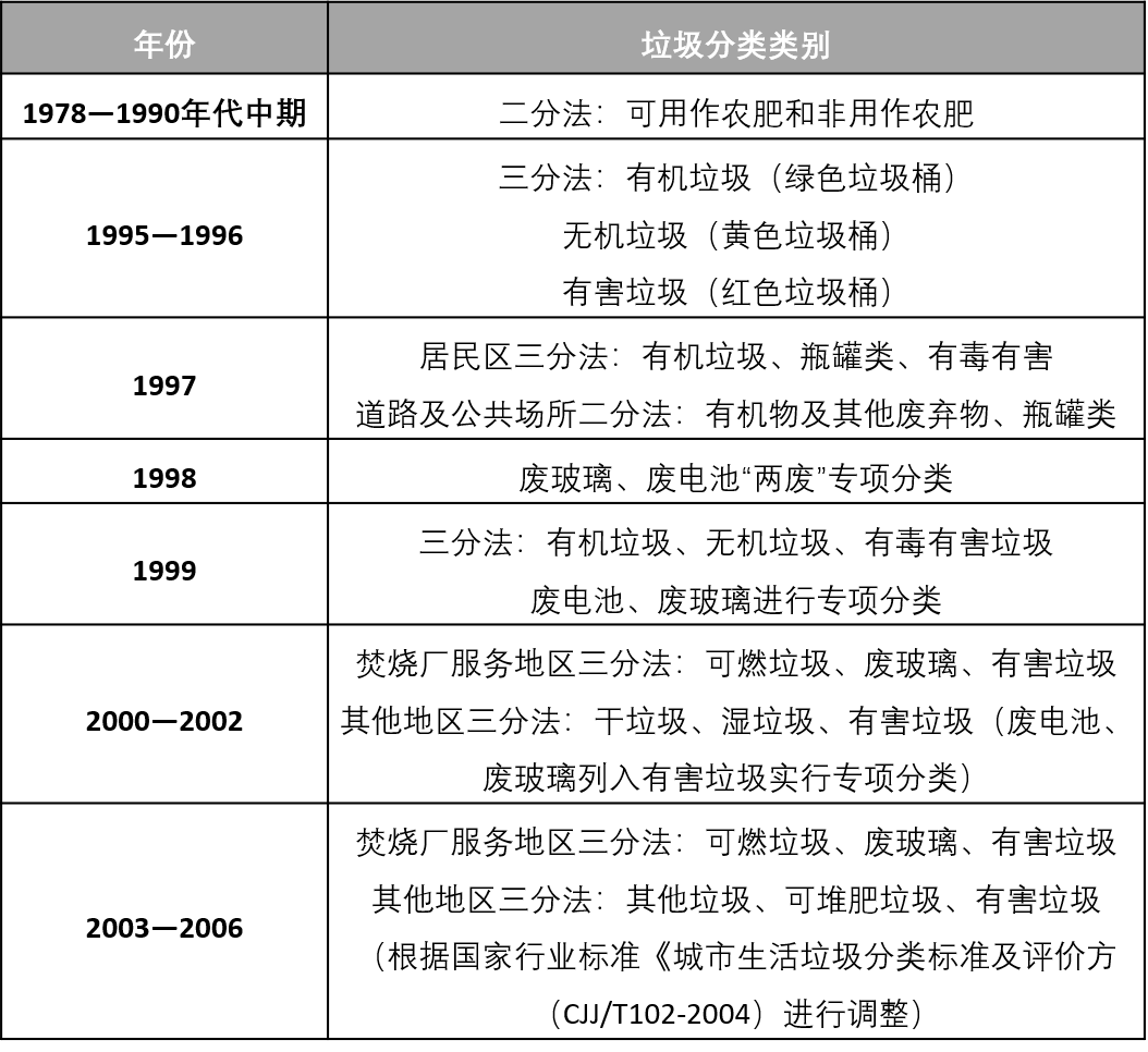 1978—2006年上海市生活垃圾主要分類方法情況表