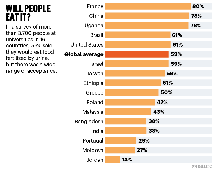 這種惰性在一定程度上可能是出于對顧客抵制的擔(dān)憂,但2021年對16個(gè)國家人們進(jìn)行的調(diào)查[7]表明,在法國、中國和烏干達(dá)等地,人們愿意食用尿液施肥的食物,比例接近80%(見“人們會(huì)吃嗎?”)。