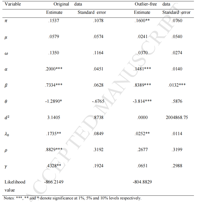 運(yùn)用GARCH-Jump模型識(shí)別EUA市場(chǎng)中的跳躍,結(jié)果如圖4。主要結(jié)論包括:(1)使用原始數(shù)據(jù)進(jìn)行估計(jì)時(shí)跳躍參數(shù)都顯著,證實(shí)了EUA市場(chǎng)跳躍的存在;(2)α+β的值表明EUA回報(bào)率波動(dòng)的高度持續(xù)性;(3)μ不顯著,反映EUA市場(chǎng)的當(dāng)前回報(bào)不受過去回報(bào)的影響,難以進(jìn)行短期預(yù)測(cè);(4)跳躍均值θ顯著為負(fù),表明由異常信息驅(qū)動(dòng)的跳躍行為對(duì)收益有負(fù)面影響;(5)跳躍方差d2的正系數(shù)顯著為正,表明由異常信息驅(qū)動(dòng)的波動(dòng)對(duì)EUA回報(bào)有正向影響;(6)跳躍強(qiáng)度系數(shù)()統(tǒng)計(jì)顯著,表明跳躍強(qiáng)度隨時(shí)間變化,ρ和γ值較高反映跳躍強(qiáng)度的持續(xù)性。