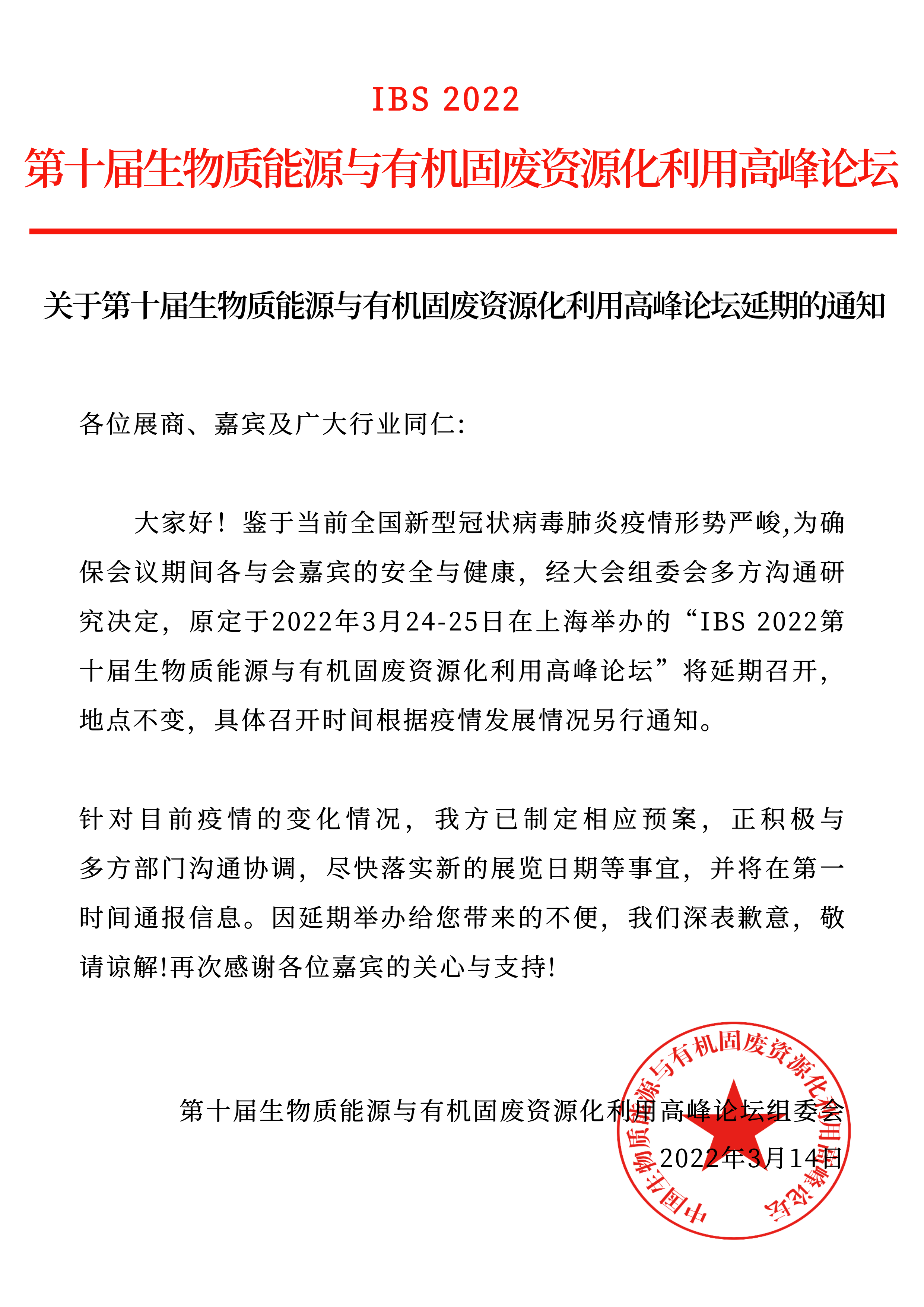 3月14日,IBS2022組委會(huì)再次發(fā)布通知,原定于2022年3月24-25日在上海舉辦的“IBS 2022第十屆生物質(zhì)能源與有機(jī)固廢資源化利用高峰論壇”將延期召開,地點(diǎn)不變,具體召開時(shí)間根據(jù)疫情發(fā)展情況另行通知。