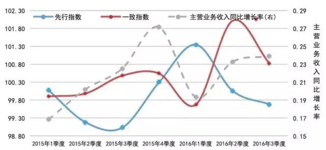 2015 年1季度-2016年3季度A股環(huán)保上市企業(yè)數(shù)據(jù)測算結果顯示:一致指數(shù)與A股環(huán)保上市企業(yè)主營業(yè)務收入增長率的變化趨勢基本吻合(如圖3所示),先行指 數(shù)的先行特征顯著,驗證了EICI指標體系的有效性。此外,對先行指數(shù)進行的周期性檢驗結果表明,主營環(huán)保上市企業(yè)的先行指數(shù)的領先周期在2015年度為 2個季度、在2016年度為1個季度(如圖4所示),該結果表現(xiàn)出環(huán)保產(chǎn)業(yè)的經(jīng)濟敏感度有所提高,即先行指數(shù)結果可用于對環(huán)保產(chǎn)業(yè)未來1個季度的走勢進行 預判。