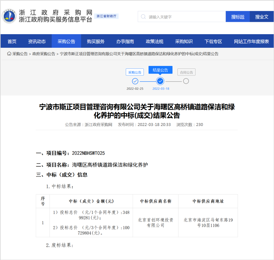 3月18日,浙江政府采購(gòu)網(wǎng)發(fā)布寧波市海曙區(qū)高橋鎮(zhèn)道路保潔和綠化養(yǎng)護(hù)項(xiàng)目中標(biāo)公告,北京首創(chuàng)環(huán)境投資有限公司以10072.9804萬元/3年的投標(biāo)價(jià)格中標(biāo)該項(xiàng)目。 近日,首創(chuàng)環(huán)境在環(huán)衛(wèi)市場(chǎng)連下兩城,中標(biāo)金額約1.6億元。