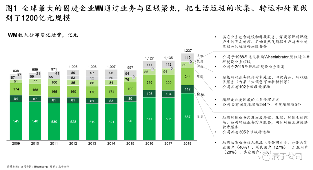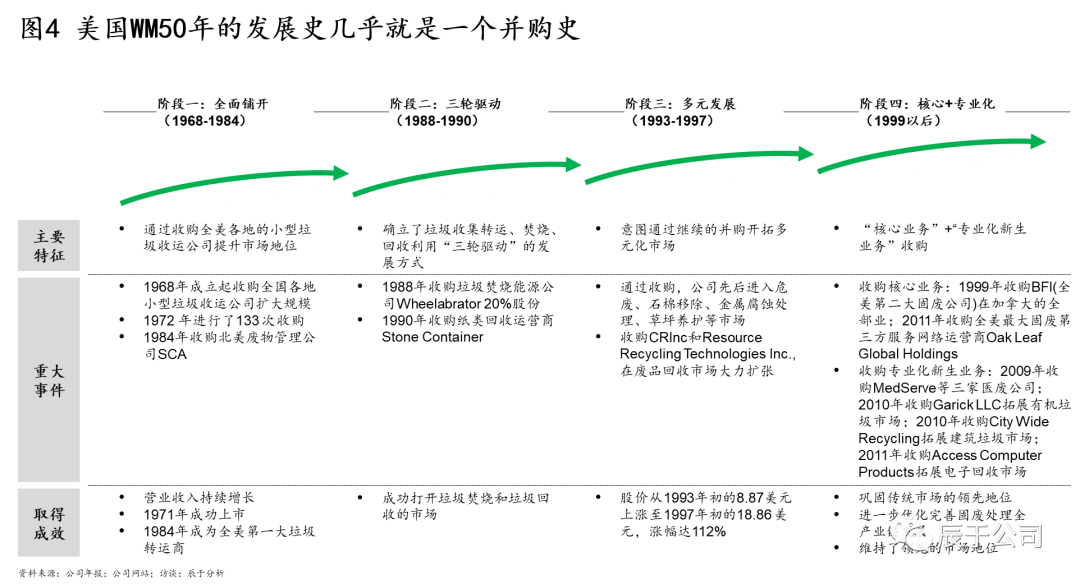 美國(guó)WM的50年發(fā)展幾乎就是一個(gè)并購(gòu)史,可分為四個(gè)階段(見(jiàn)圖4):1968~1984年全面鋪開(kāi)階段,通過(guò)收購(gòu)全美各地的小型垃圾收運(yùn)公司提升市場(chǎng)地位,其中1972 年就進(jìn)行了133 次收購(gòu),1984年收購(gòu)北美廢物管理公司SCA之后,成為全美第一大垃圾運(yùn)轉(zhuǎn)商;1988~1990年三輪驅(qū)動(dòng)階段,確立了垃圾收集轉(zhuǎn)運(yùn)、焚燒、回收利用“三輪驅(qū)動(dòng)”的發(fā)展方式,通過(guò)并購(gòu)垃圾焚燒能源公司W(wǎng)heelabrator和紙類(lèi)回收運(yùn)營(yíng)商Stone Container等手段實(shí)現(xiàn);1993~1997年多元發(fā)展階段,WM意圖通過(guò)大舉并購(gòu)開(kāi)拓多元化市場(chǎng),通過(guò)收購(gòu)先后進(jìn)入危廢、石棉移除、金屬腐蝕處理、草坪養(yǎng)護(hù)等市場(chǎng),股價(jià)從1993年初的8.87美元上漲至1997年初的18.86 美元,漲幅達(dá)112%(不過(guò)事后證明這個(gè)階段的過(guò)度多元化并購(gòu)是失敗的);1999年以后WM開(kāi)始專(zhuān)注在核心業(yè)務(wù)+專(zhuān)業(yè)化新生業(yè)務(wù)的并購(gòu),其中核心業(yè)務(wù)收購(gòu)了BFI(全美第二大固廢公司)在加拿大的全部業(yè)務(wù)和全美最大固廢第三方服務(wù)網(wǎng)絡(luò)運(yùn)營(yíng)商O(píng)ak Leaf Global Holdings,這些并購(gòu)不僅鞏固了WM傳統(tǒng)市場(chǎng)的領(lǐng)先地 U7Y位,也完善了固廢處理全產(chǎn)業(yè)鏈布局。